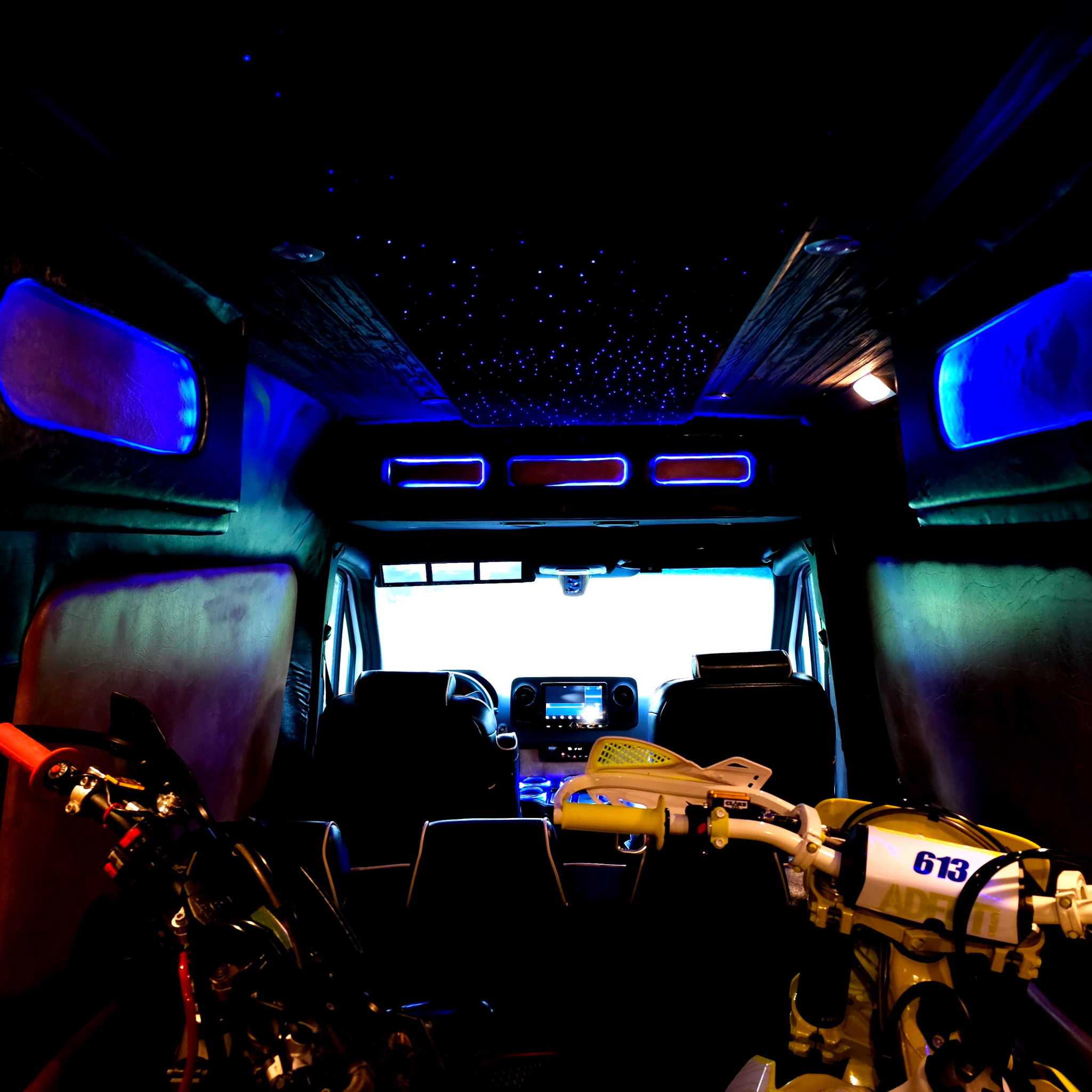 This is possible one of the most beautiful MOTO vans ever built. Custom seating, with heated, massage caption chairs, all electric. Passenger seat has electric foot rest. Back bench seat recliner. 13 speaker sound system with two amps and large screen head unit. This van has 5 layers of insulation in the building that makes the ride quiet and the sound system sound amazing. Custom lighted center console has 5 drink holders and electric drawer. Three screens above the driver allow for full view of both sides and rear to eliminate blind spots. Overhead cabinets all are lit and have electric doors. This van will hold three dirt bikes inside and has a customer carrier for the back that holds a fourth bike. No straps needed to carry two dirt bikes thanks to footpeg hold downs. Bikes can be loaded in seconds. There is a Custom boot holder and can can storage along with places for all your gear. The exterior of the van was kept plain on purpose. If parked at a hotel or traveling, no one knows about the bikes and gear inside. Runs perfect, tires great, everything maintained perfectly. This van is awesome.