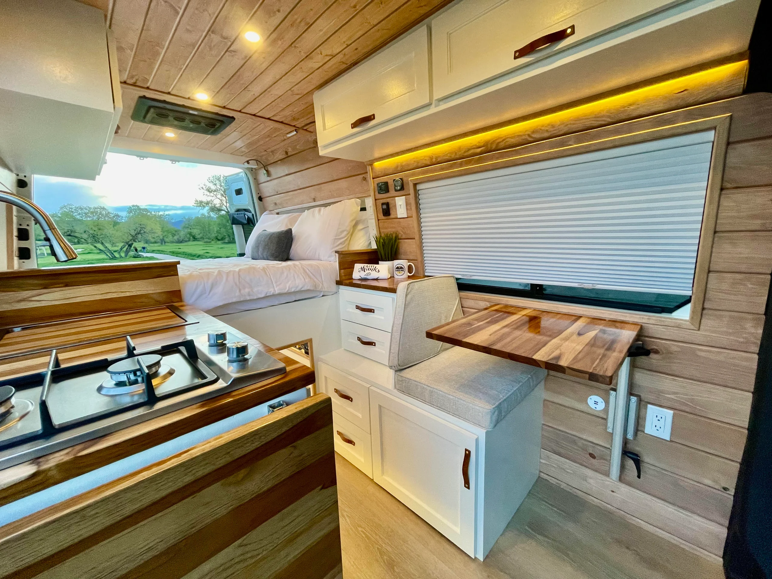 We have added Vanspeed Van Capsules to allow space for a Queen Mattress so 2 can sleep comfortable. And, with the forward-facing seat and placement of the lagun table mount, there’s a perfect sitting area for two on the driver’s side.
