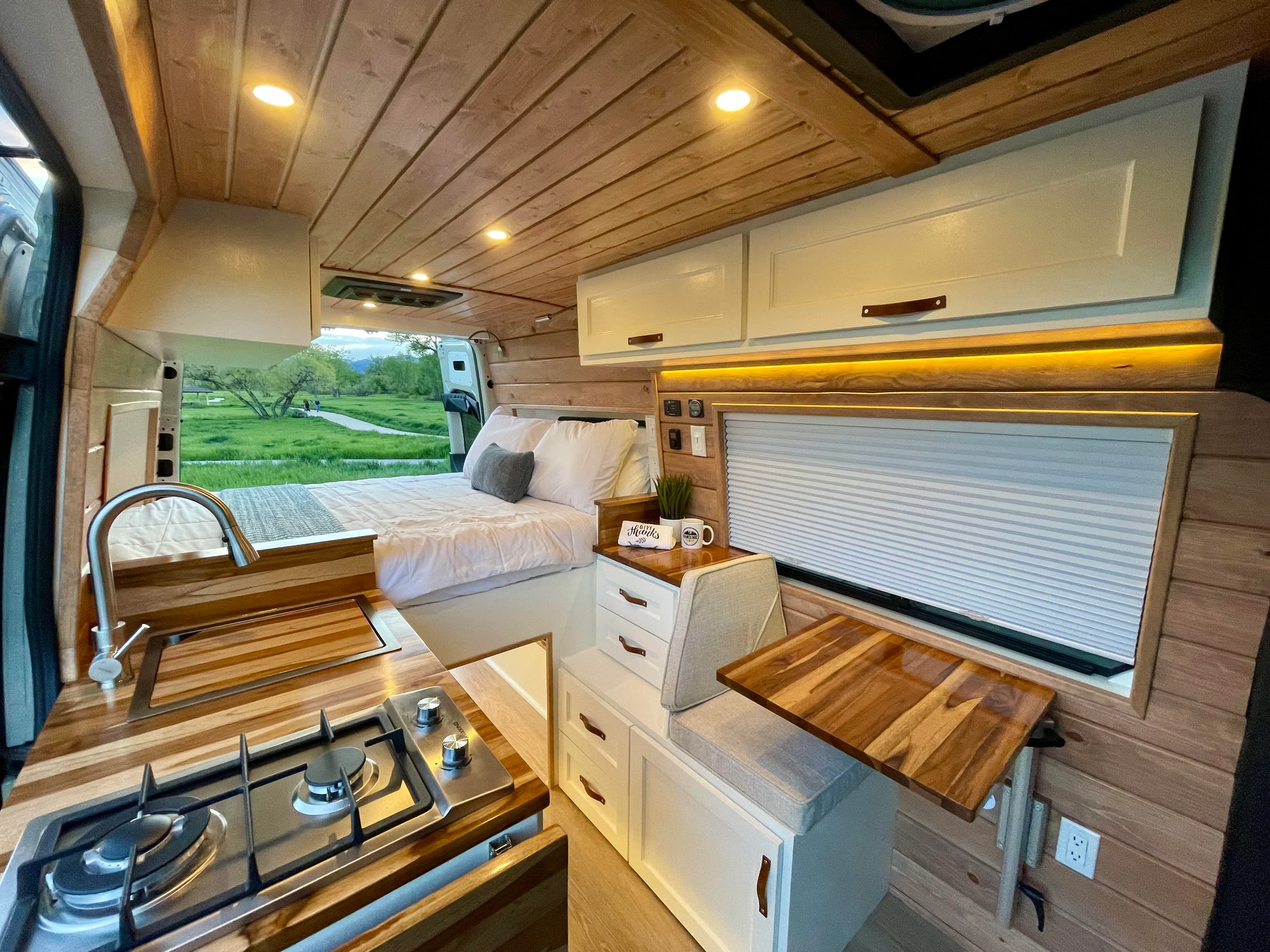 Every square inch of the interior has been hand-touched by us down to the leather handles we use on our cabinets. Attention to detail is so important to us and our builds. Buckeye has a light airy, cabin feel. Perfect for waking up overlooking the Ocean or those Mountain views we can’t get enough of here in the Rockies!